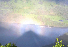 新疆喀納斯湖上空突現 “佛光”現象。當日游客 在喀納斯觀魚亭旅游觀光,突然發現在喀納斯湖二道灣上空出現了一個直徑約數十米的美麗的七彩光環,甚是壯觀。“佛光”大約持續了十幾分鐘后便逐漸隱去。