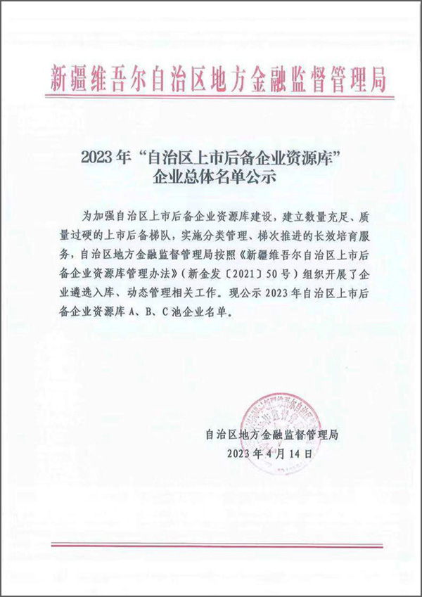 列入“自治區上市后備企業資源庫”的企業,是自治區政府為加強自治區上市后備企業資源庫建設而建立的數量充足、質量過硬的上市后備梯隊。自治區企業上市推進工作領導小組辦公室按照《新疆維吾爾自治區上市后備企業資源庫管理辦法》進行企業遴選入庫、動態管理,對入選的企業實施分類管理、梯次推進的長效培育服務,旨在深入發掘擬上市企業資源,優化資源配置,加強多層次資本市場建設,促進自治區企業在多層次資本市場上市、掛牌和融資。
