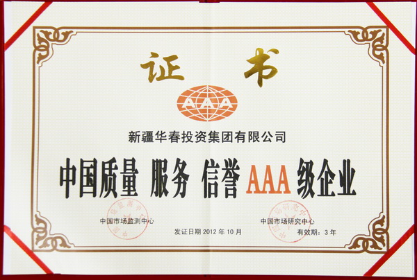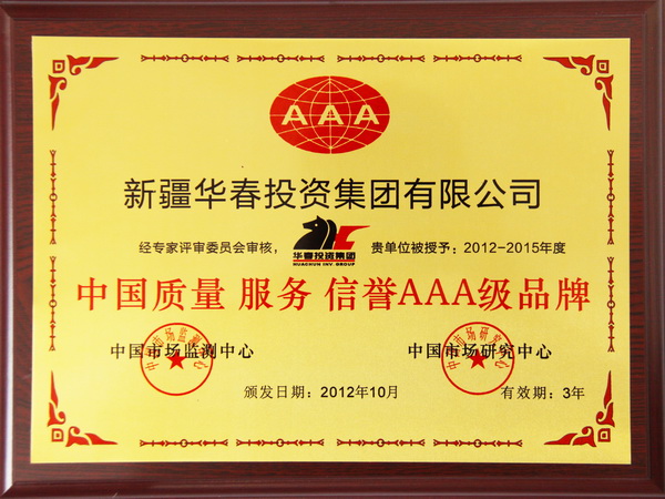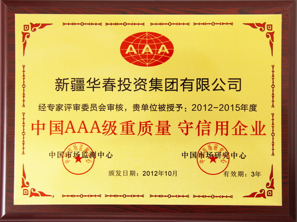 2012年12月,經中國市場監測中心、中國市場研究中心對新疆華春投資集團進行綜合考證和量化分析,華春投資集團榮膺“中國AAA級重質量守信用企業”、“中國質量 服務 信譽AAA級企業”、“中國質量 服務 信譽AAA級品牌”榮譽稱號,頒發了榮譽證書和獎牌。